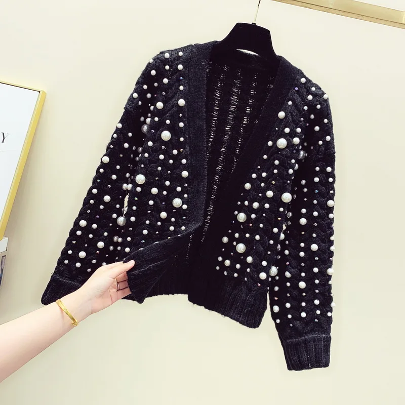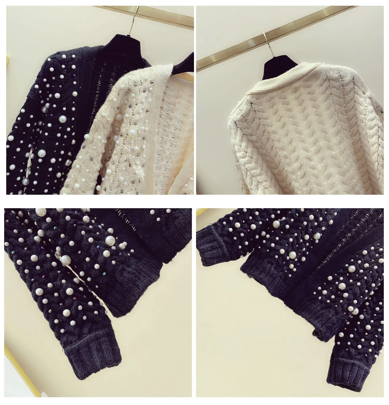 Big Sale Autumn Winter Black Knitting Cardigan Sweater Womans New Hand Bead Thick Thread Twist Knitted Cardi