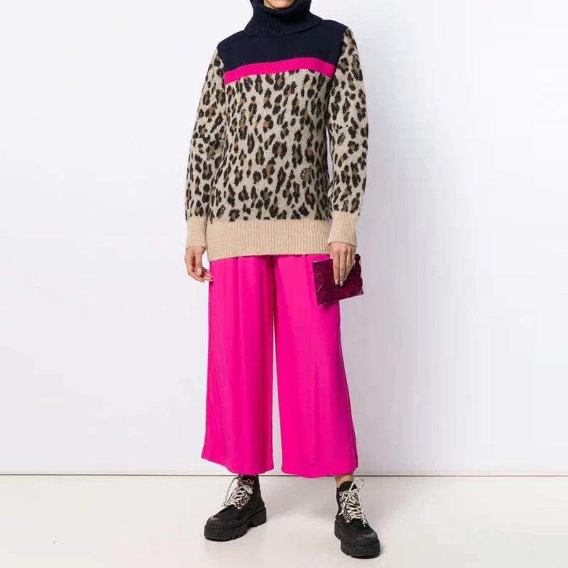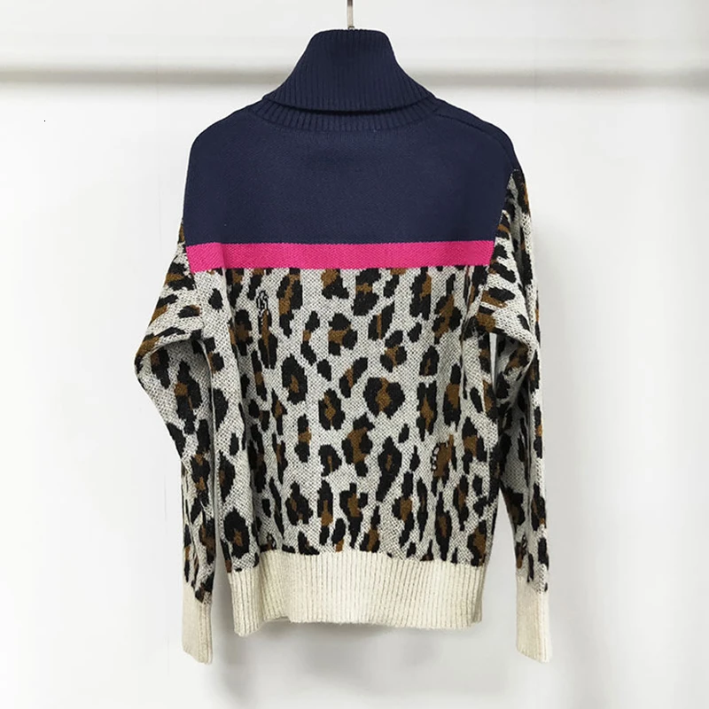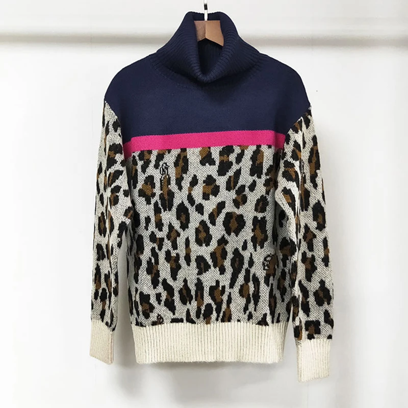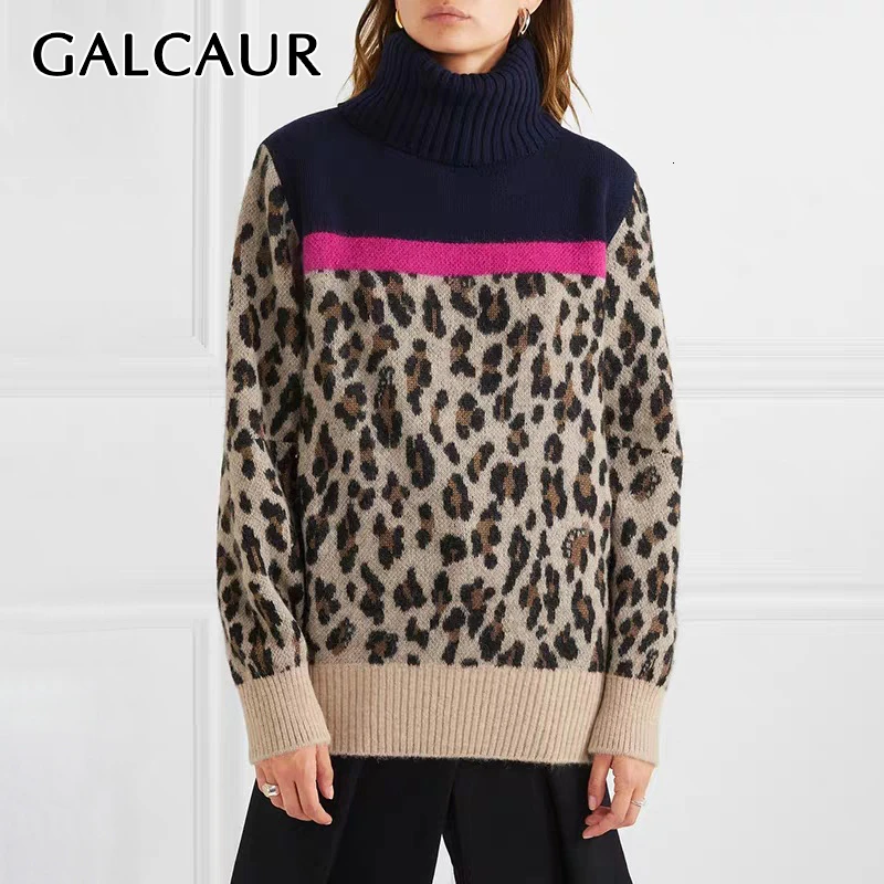 Big Sale GALCAUR Leopard Hit Color Sweater For Female Turtleneck Long Sleeve Wool Knitting Large Size Women'
