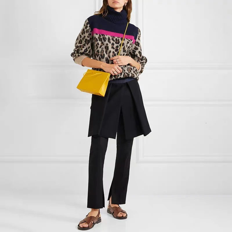 New Arrival GALCAUR Leopard Hit Color Sweater For Female Turtleneck Long Sleeve Wool Knitting Large Size Women'