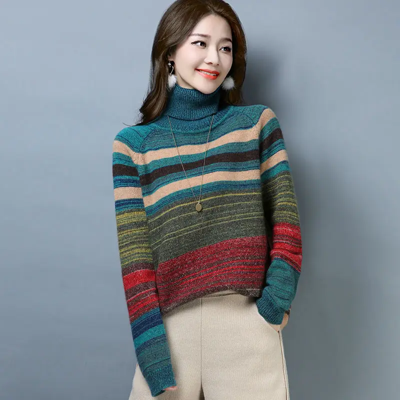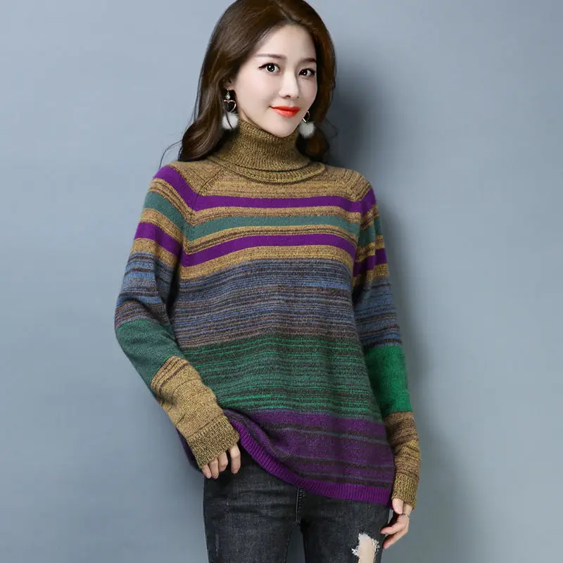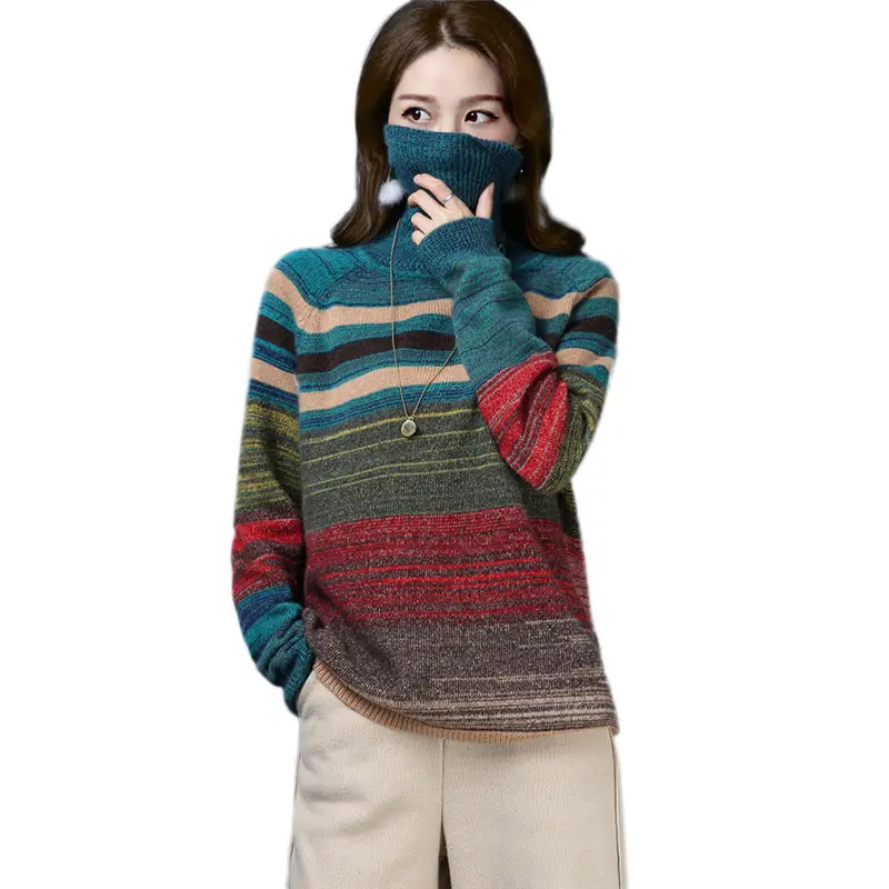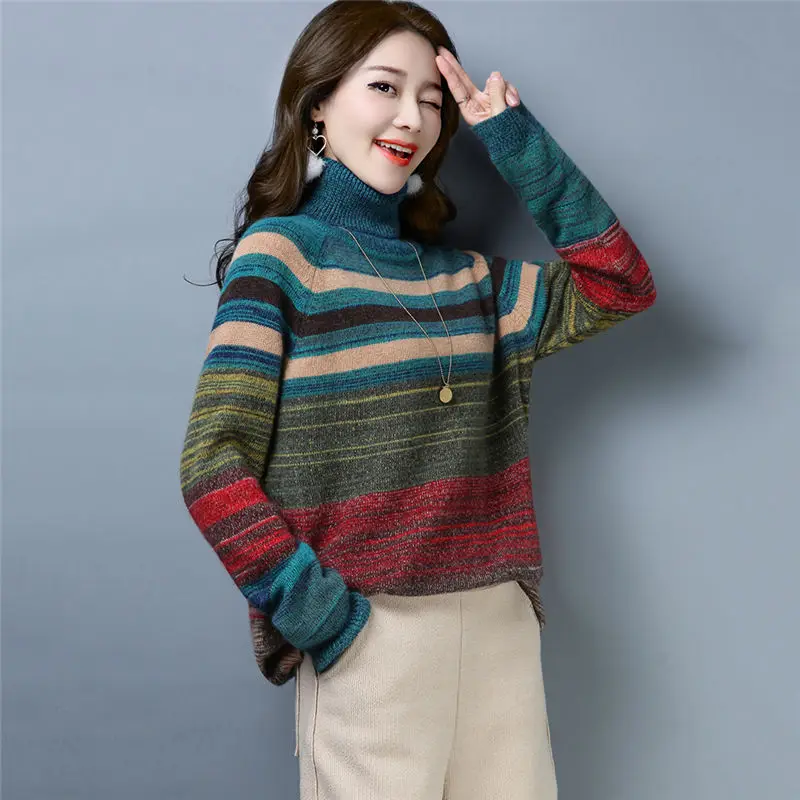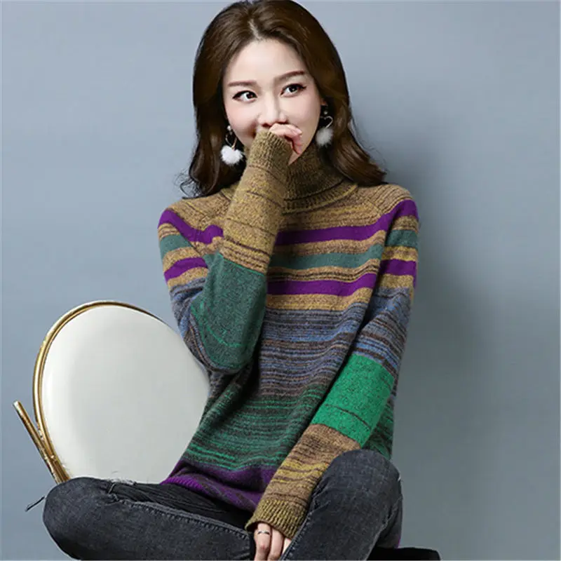 Big Sale Women Knitted Sweater New Autumn High Collar Color Pullover Leisure Long Sleeve Knitwear Spring Str