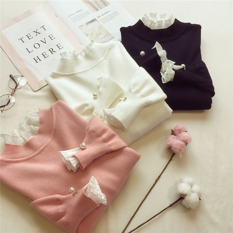New Arrival Korean sweet chiffon splicing loose sweater jacket fashionable knit shirt backing pearls mesh flare