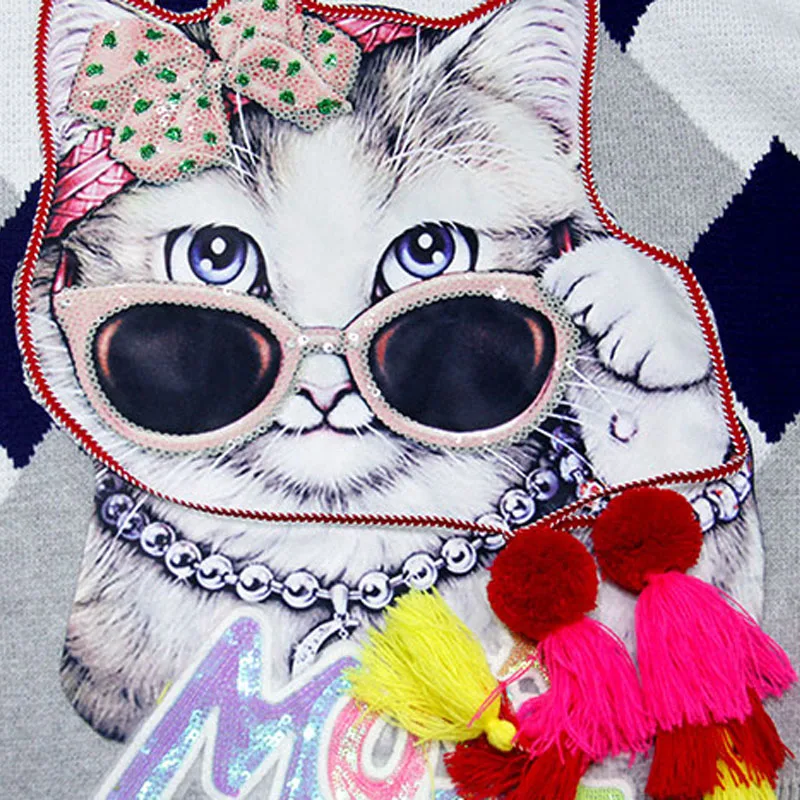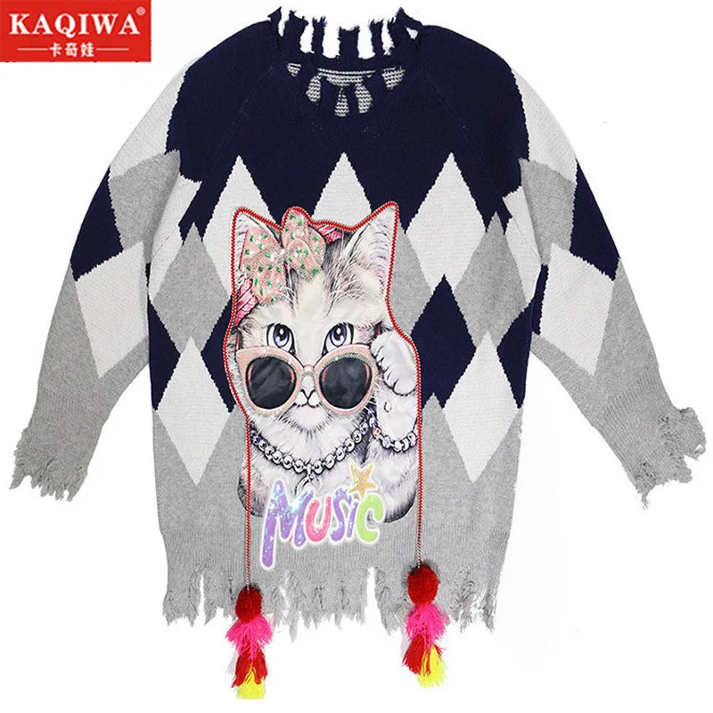 Hot Product Cartoon sweater women's autumn and winter Korean paillette cat with broken edge V-neck and loose kn
