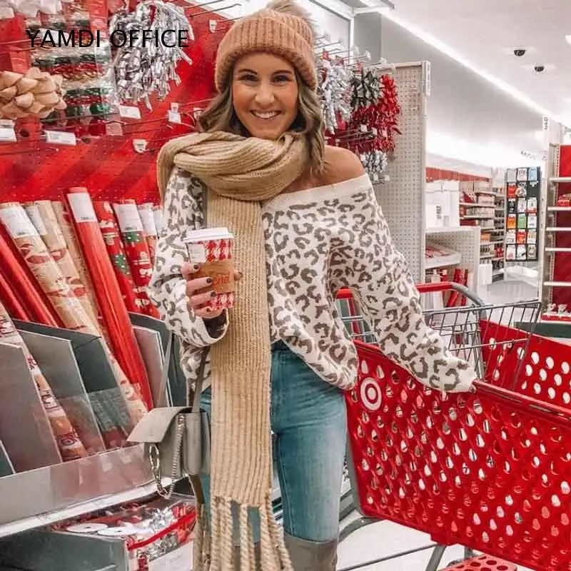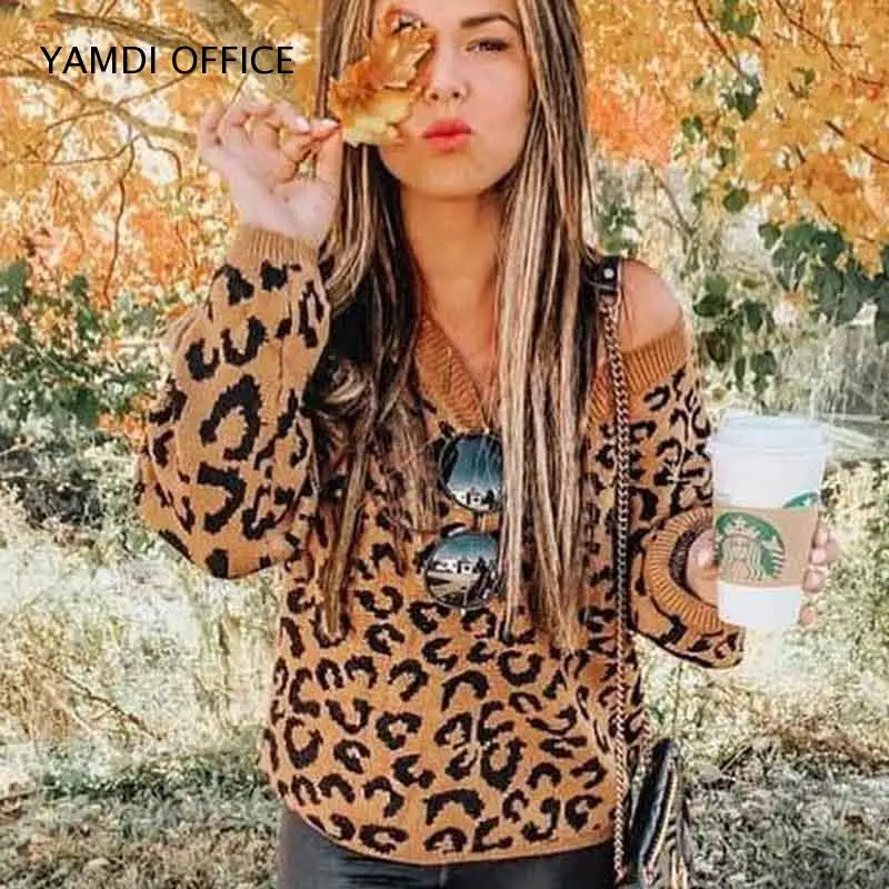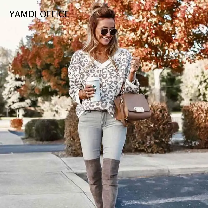 Buy YAMDI Women leopard sweater autumn winter v neck fashion casual knitwear elegant chic pullover luxu