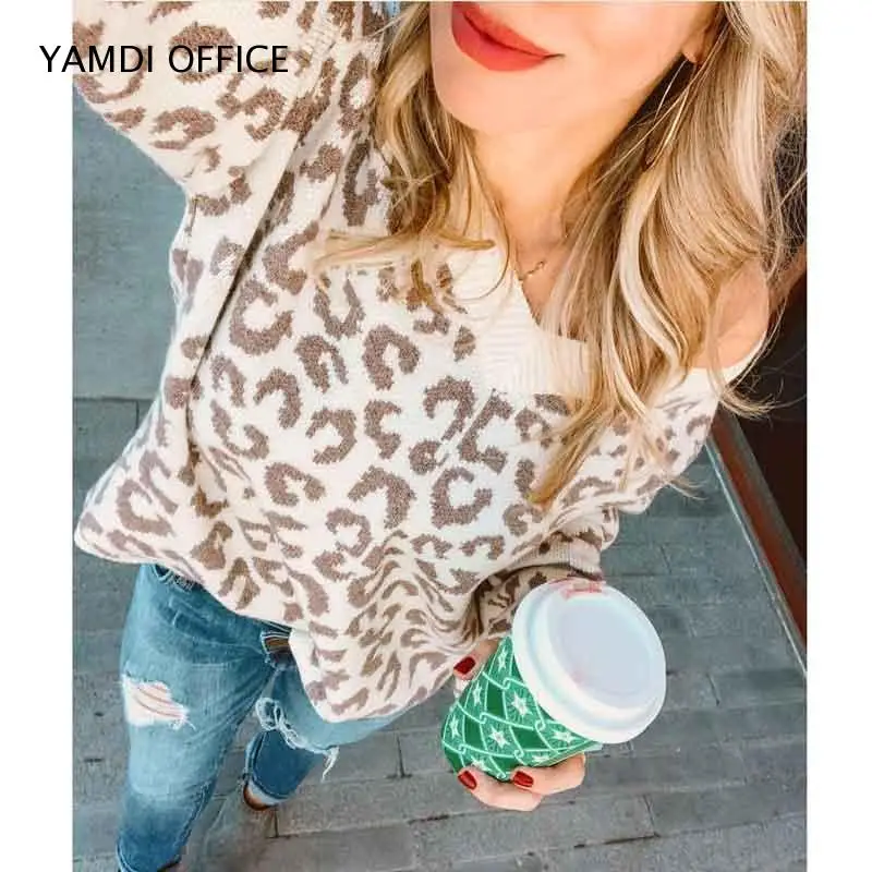 Hot Product YAMDI Women leopard sweater autumn winter v neck fashion casual knitwear elegant chic pullover luxu
