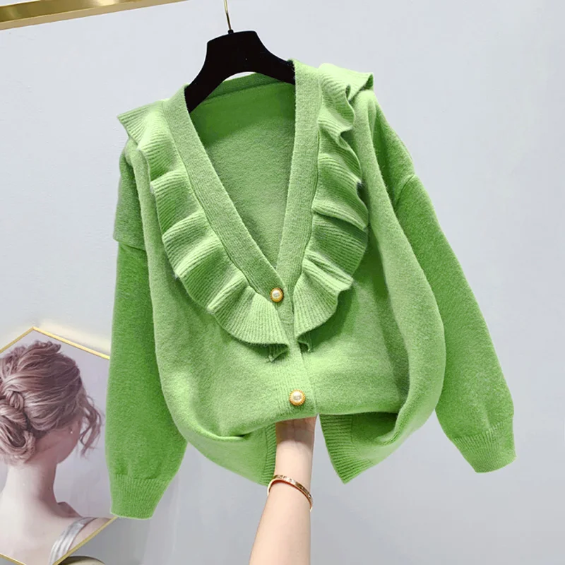 Big Sale winter new ruffles v-neck women sweaters lantern sleeved solid green pink office lady elegant thick