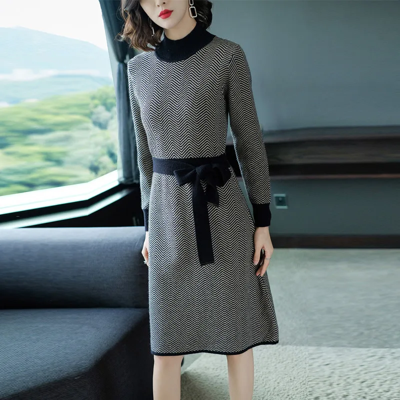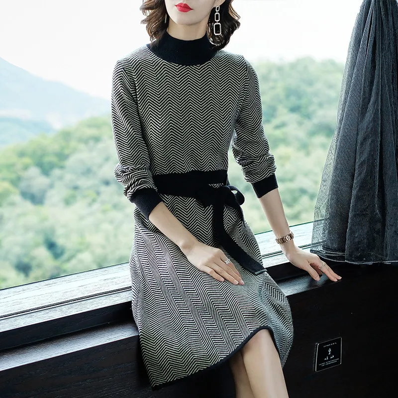 Best Price Spring Autumn Woman Knit Dress 2019 New High-Necked Pullover Striped High Quality Knitwear Mid Wais