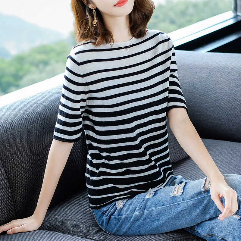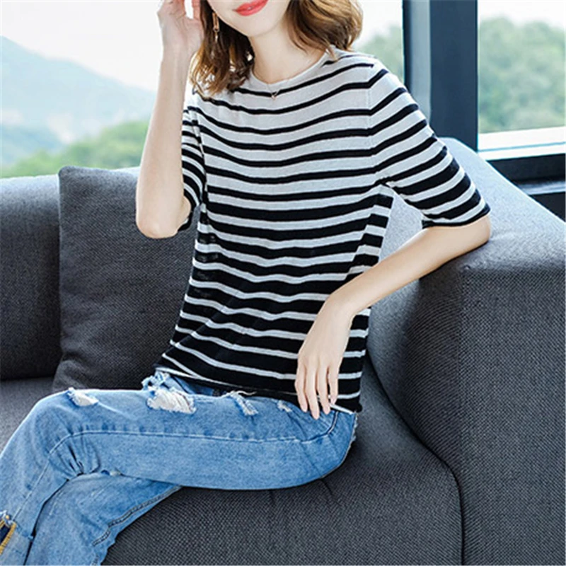 Hot Promo Thin Wool Knitwear Female 2019 Spring New Bottoming Striped Sweater Half Sleeve Autumn Fashion Slim
