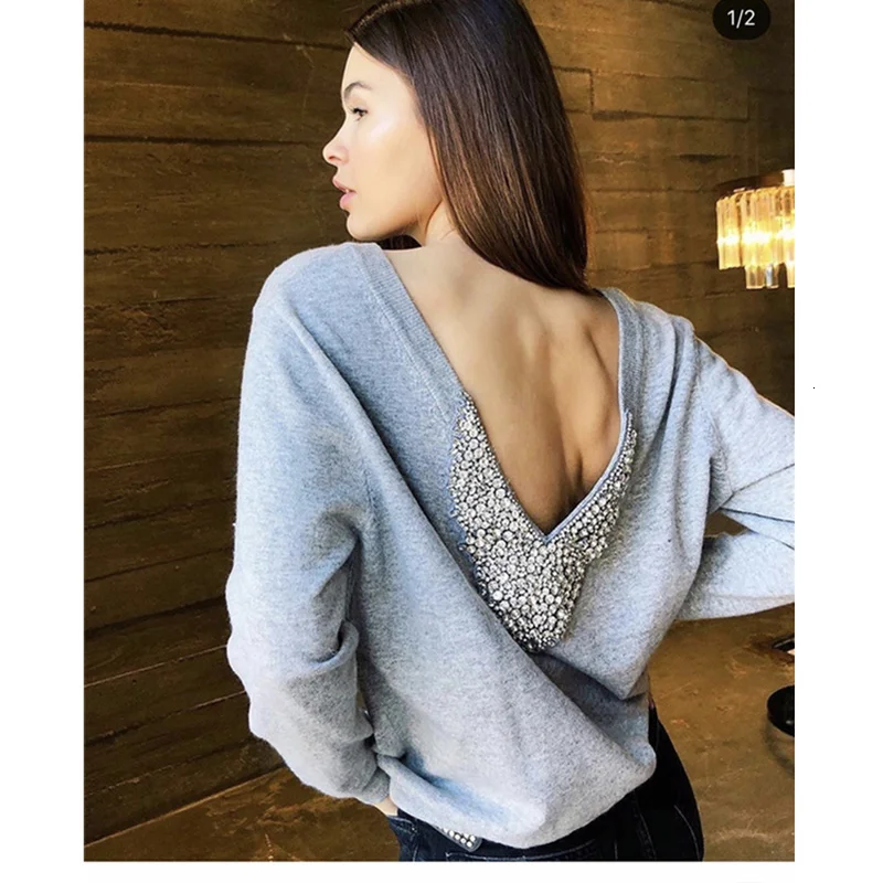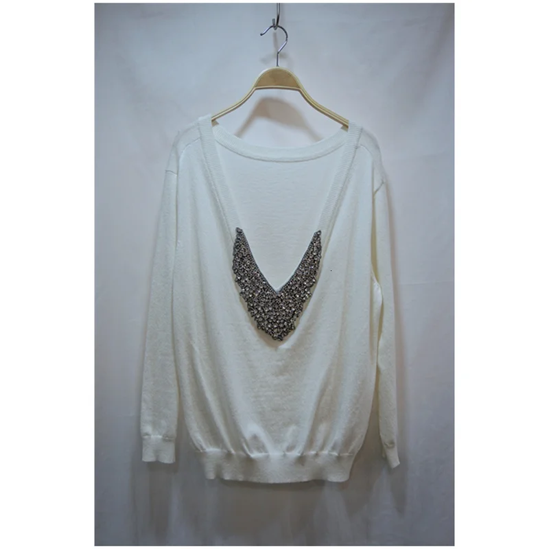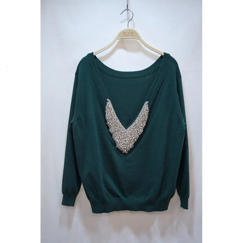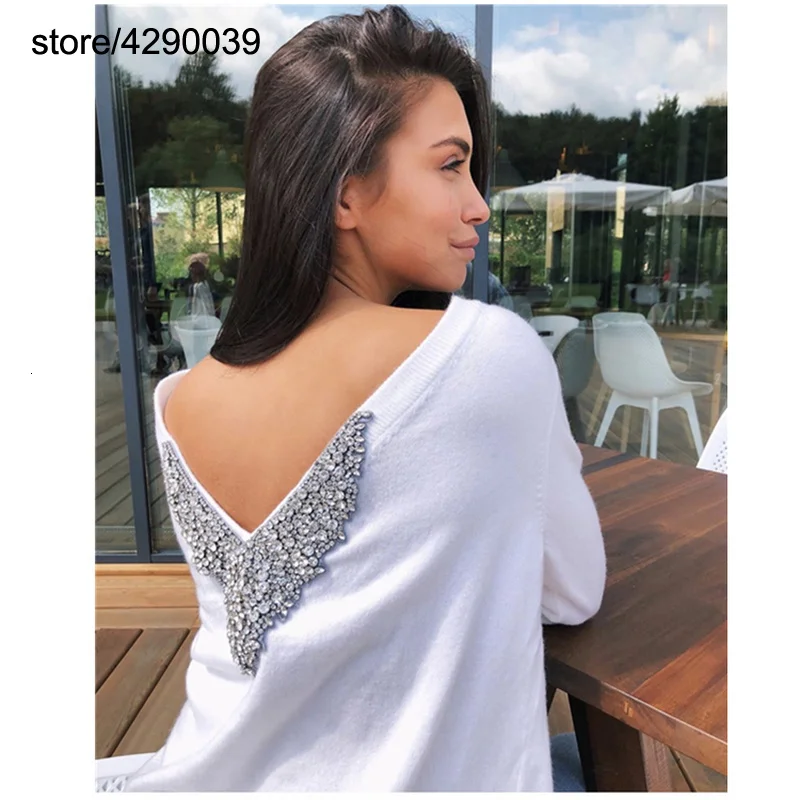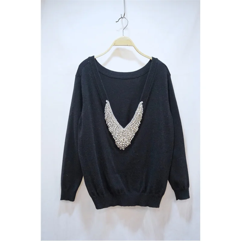 Best Price 2019 New Women Back Diamond Beading Deep V Neck Cashmere Woolen Sweater Warm Knit Female Warm Winte