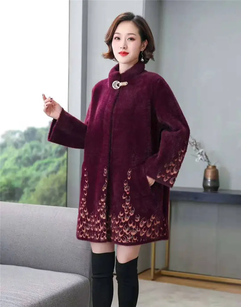 Cheap Oversized Mother clothing Long Sweater Coat Female Half-high Collar Print Mink Fur Coat Women Middl