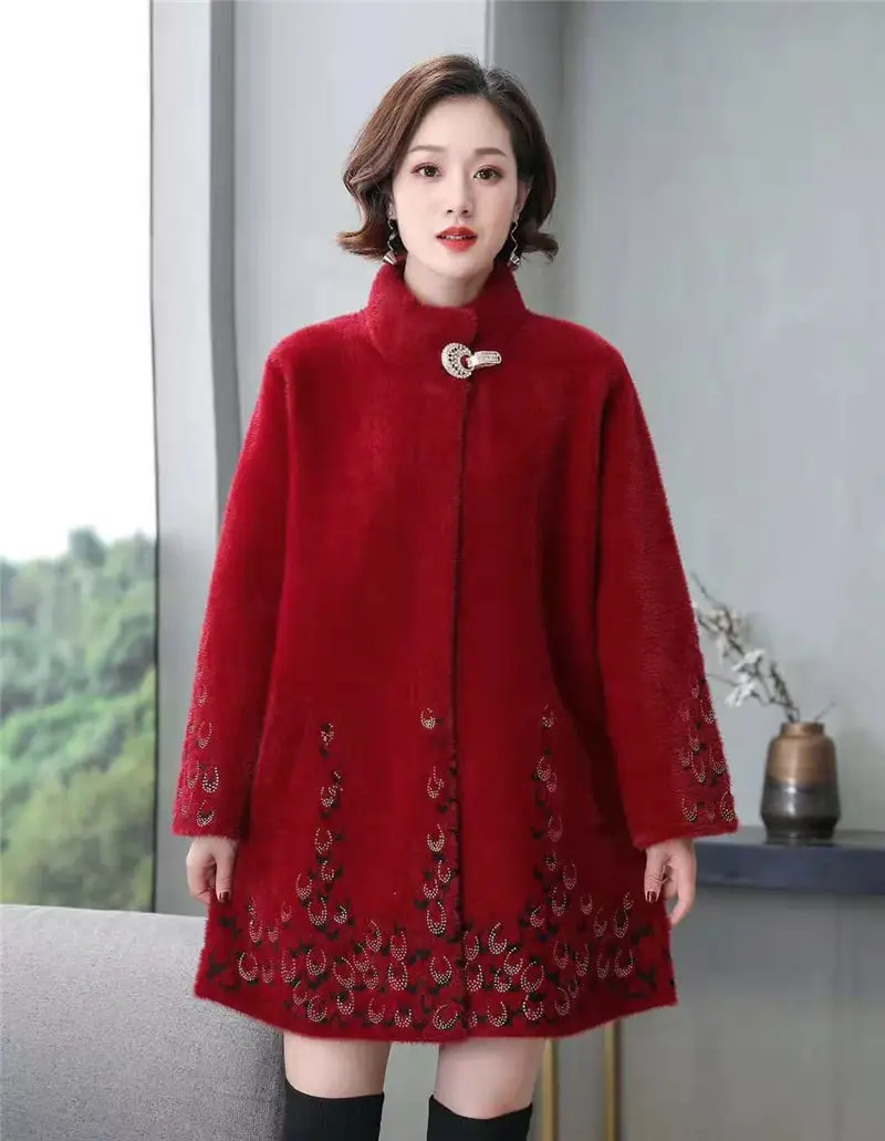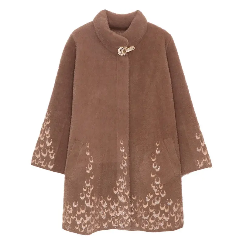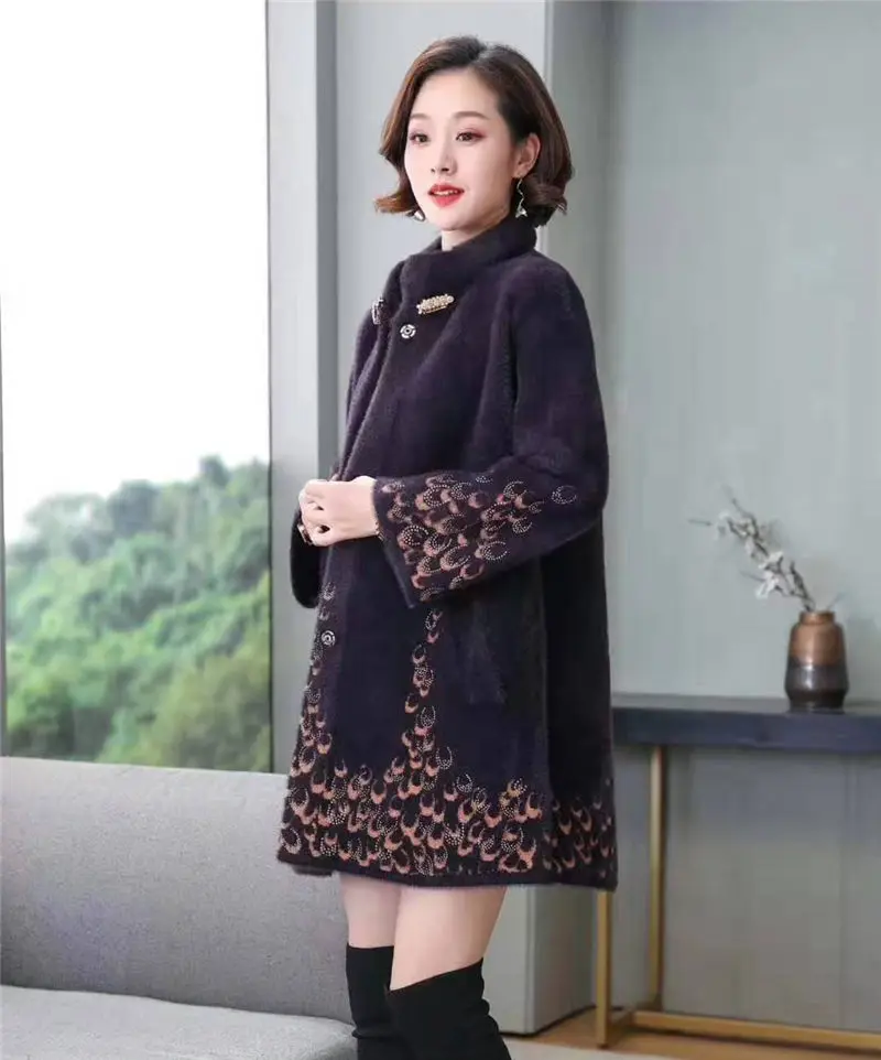 Wholesale Oversized Mother clothing Long Sweater Coat Female Half-high Collar Print Mink Fur Coat Women Middl